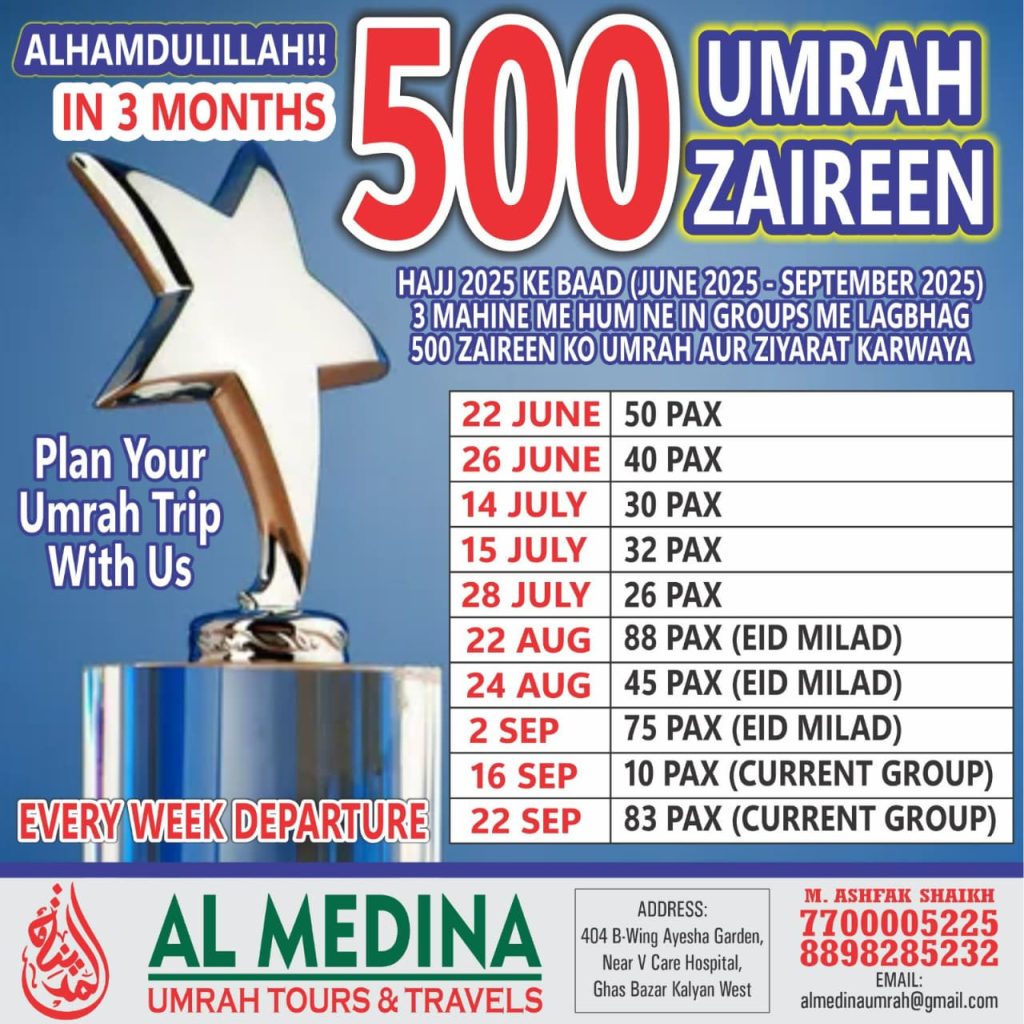 Alhamdulillah! In just three months following Hajj 2025 (June to September 2025), AL MEDINA UMRAH Tours & Travels successfully facilitated Umrah and Ziyarat for nearly 500 zaireen across multiple group departures. This achievement reflects the trust and satisfaction of our valued clients, and our commitment to providing well-organized, comfortable, and spiritually enriching journeys. With weekly group departures, including special trips during Eid Milad, we continue to serve pilgrims with dedication and professionalism. Plan your Umrah trip with us and experience seamless travel, guided service, and heartfelt hospitality every step of the way.